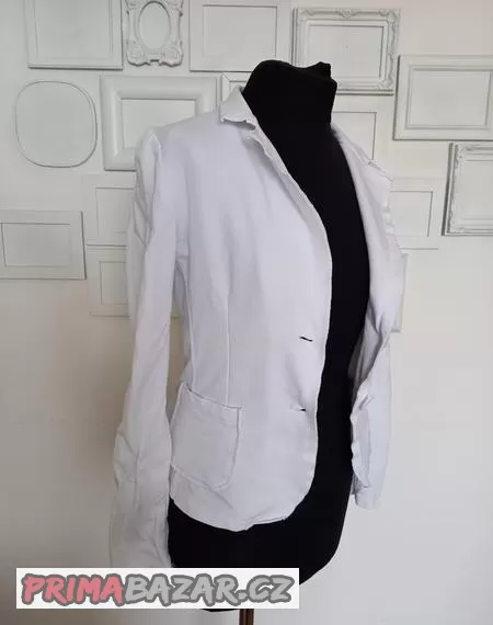 Bílé teplákové sako. Velikost S, odpovídá. Materiál 95 % bavlna, 5 % elastan. Pěkně pruží a přizpůsobí se postavě. Materiál připomíná teplákovinu. V krásném stavu, měla jsem ho na sobě jednou nebo dvakrát. V průramcích 2 x 44 cm, pruží, délka 51 cm. Na rukávech falešné záplaty.
