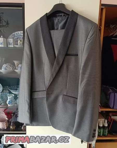 Prodám krásný nový šedočerný oblek, velikost 52. Výroba Maďarsko, tam i koupený. Nikdy nenošený, pouze vyzkoušený, luxusní látka. Bohužel zvolena špatná velikost. Šedá v kombinaci s černou klopou. Vhodný k různým příležitostem, např.na svatbu.