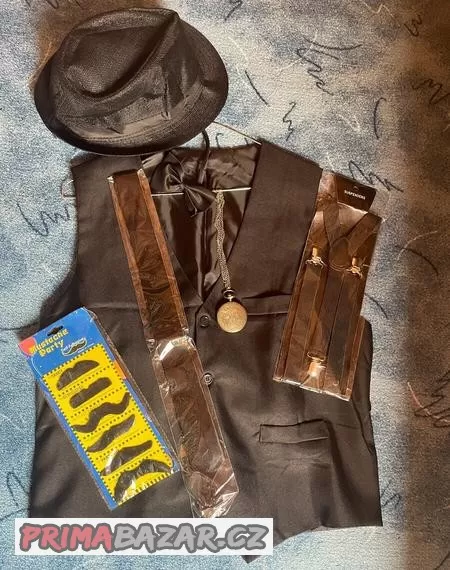 Prodám nepoužitý nerozbalený kostým ve stylu 30. let. Sada obsahuje vestu (velikost M/L), klobouk, motýlka, kravatu, příruční hodinky, nalepovací kníry, kšandy. Původní cena 1200 Kč, prodám za 700 Kč + doprava.