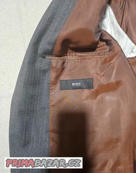 Prodám pánský oblek značky BOSS, šedý s jemnými proužky, vysoký lesk. Oblek je vemi málo nošený.
