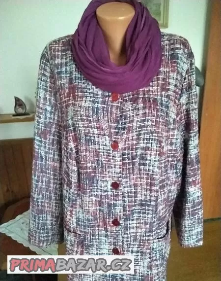 Jarní melirovane sako bez límce kapsy polyester nemacka se vel 50/52 přes prsa 122 délka 71 cm velmi zachovale příjemné cena včetně šálky