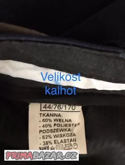 Délka nohavic od rozkroku 77cm, obvod pasu 76 cm. Sako: délka rukávu 64-65 cm, ramena 41cm, obvod hrudníku 88cm.