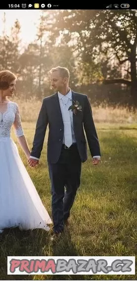 Prodám krásný pánský oblek (vzhledem k velikosti klidně i jako chlapecký oblek třeba do tanečních) modré barvy od firmy LARÉ Collection, barva dobře odpovídá fotkám od výrobce, krásně sytá tmavě modrá. Kvalitní provedení. Manžel ho měl jako svatební, velikost je na opravdu drobného muže, kalhoty měl ještě v pase zmenšované. Případně mohu na dotaz přeměřit. Původní cena 5800,-. Oblek nebyl v čistírně. Na prodej mám také svatební bílou regatu s kapesníčkem, viz foto.