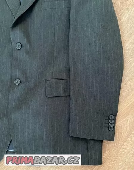 Přední zapínání na knoflík. Lemovaná náprsní kapsa. Dvě přední kapsy s lemováním a klopou. Dlouhý rukáv s manžetami na knoflíčky. Podšívka. Detail zažehleného pruhu vpředu a vzadu. Dvě lemované kapsy vzadu. Dvě boční kapsy. Přední zapínání na zip , háček a dva knoflíky. Poutka na pásek. Velikost 52, barva šedá, oblek je nový nenošený.