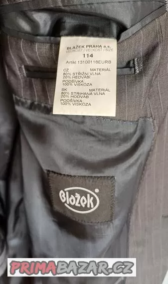 Pracovní oblek značky BLAŽEK, materiál 80% střižní vlna, 20% hedvábí, šedá s proužkem, šedá podšívka. Já postava 186 cm, 95 kg.