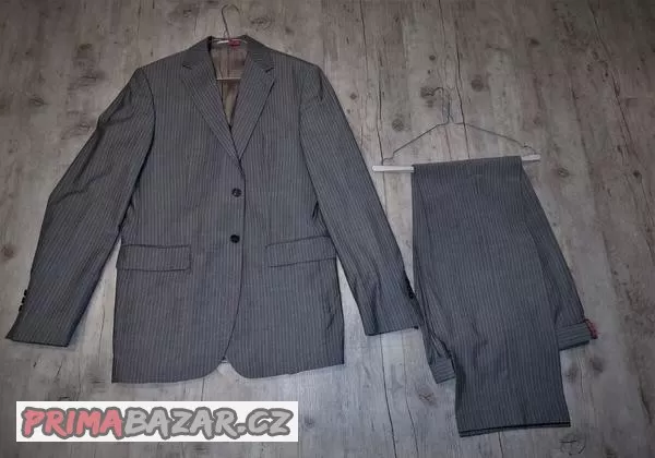 Prodám tento pánský oblek šedé barvy. Velikost L (uvedené míry jsou 188/104/90). Jedinou vadu kterou jsem našla je rozpáraná kapsa uvnitř - není vidět. Oblek je vyčištěn a vyžehlen z čistírny.