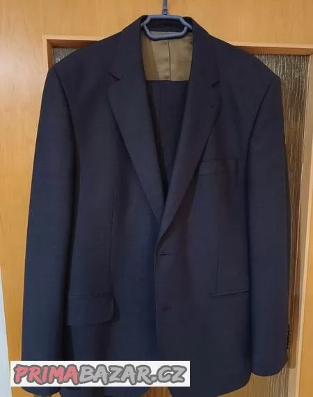 Krásný tmavě modrý oblek, jenom párkrát oblečený. Velikost psaná 27 (řekla bych odpovídá 54), rozměry: délka saka 74 cm, v ramenou 49 cm, délka rukávu 66 cm, dále kalhoty - pás 100 cm, délka nohavic 104 cm, od rozkroku 77 cm. Kupováno v podnikové prodejně Vývoj Třešť. Možno vyzkoušet v Brně.