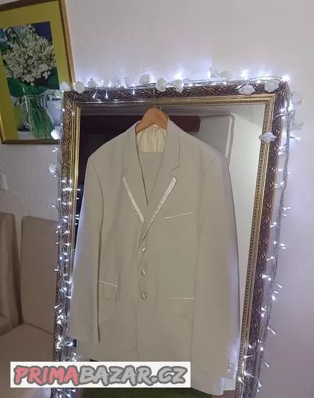 Nabízím pánský oblek, barva šampaň,saténové lemy a knoflíky, vhodný na vyšší postavu.Sako, vesta, kalhoty, 1x použitý, výprodej ze salonu.