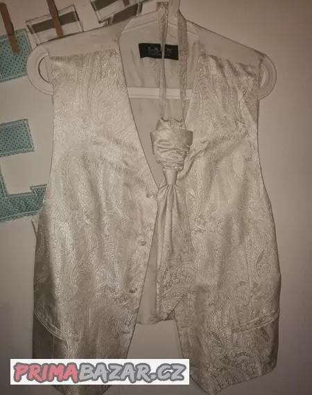 Prodam pansky nepoužitý společenský set. Kravata zavazovani za háček, uzel je napevno. Barva ivory/perletova.