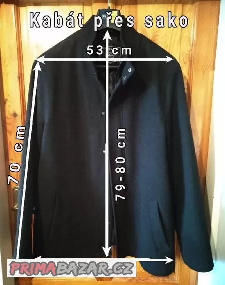 Prodám pánský kabát přes oblek , tmavý , dvě vnitřní náprsní kapsy , dvě venkovní , vel.XXL , rozměry cca na obrázku .