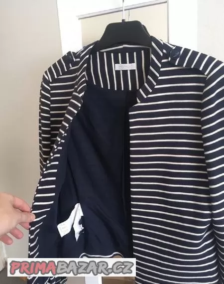 Sako/přehoz bez zapínání - velikost je díky tomu celkem univerzální od S až po menší L, námořnický styl, 100% bavlna, rozměry: délka středem zad - 53 cm, délka rukávu od ramene - 62 cm. Nenošené, pouze ustřižená cedulka, PC 1200 kč