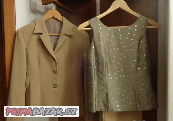 Kalhotový kostým s blůzou pošitou zlatými penízky, minimálně nošené, jako nové. Značené jako italská 44, ale pasuje na vel. M.