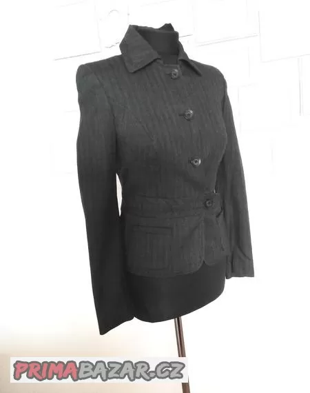Sako Next. Šedý melír. Materiál 49% polyester, 49% viskóza, 2% elastan, podšívka 100% polyester. Zajímavé zapínání, dvě kapsy. Velikost uvedena 8, odpovídá. Rozměry: v průramcích 2 x 43 cm, délka 52 cm. Top stav.