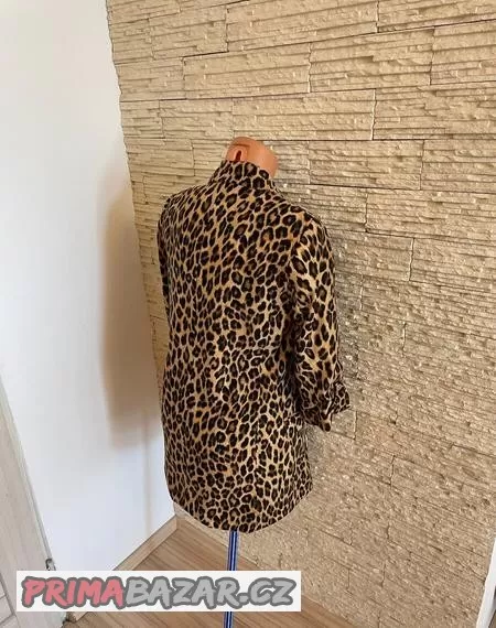 Otevřené sako ZARA s klopami do špičky a ohrnutým rukávem v délce pod loket s připínacím páskem a zlatým knoflíkem.