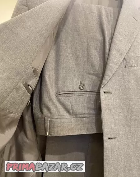 Pánský oblek zn. Rene Lezard ze 100% panenské vlny. Vel. 50. Lehce ošoupaná dvě poutka na pásek - viz poslední foto.