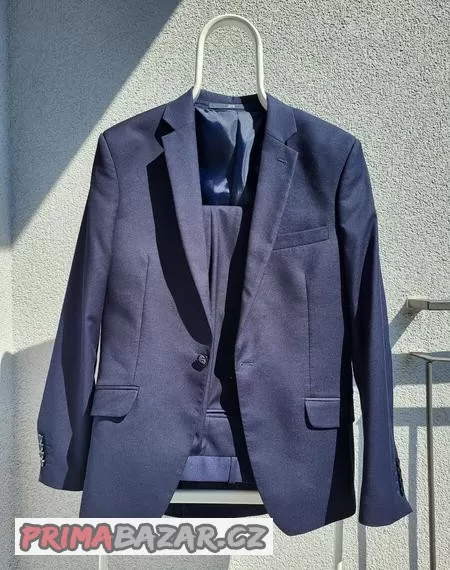 Prodám oblek tmavě modré barvy Feratt, ultra slim line, velikost 176/48 (kalhoty 176/48/84), velmi málo nošený, ideální do tanečních.