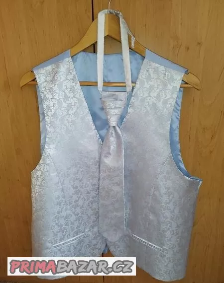 Prodám svatební vestu, regatu a kapesníček ve světle modré barvě. Velikost 56. Použité 1x, vyprané, jako nové.