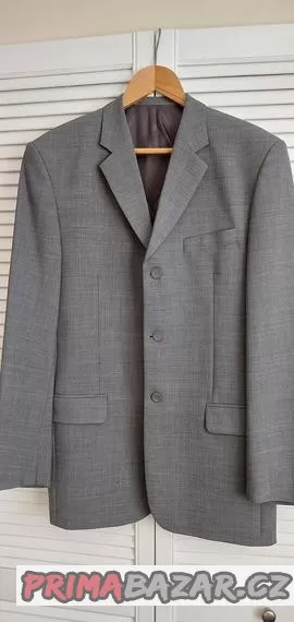 Sako, vesta velikost 102, kalhoty v pase 90 cm. Na vyšší postavy (cca 185 cm). Materiál: polyester, vlna, lycra. Volnější střih.