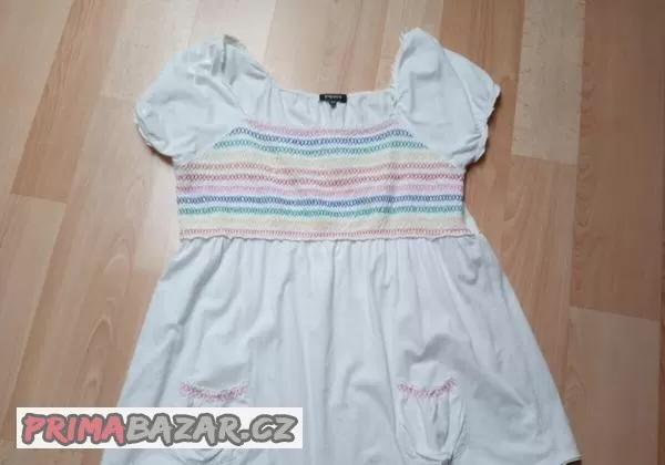 Prodám proužkovanou černošedou bavlněnou košili bez límečku s dlouhým rukávem, vel.40/42/44, cena: 90kč+pošta, bílou halenku/triko venkovského stylu, vel. 44/46/48, se žabičkováním, cena: 150kč+pošta, elastické šaty bez ramínek nebo maxisukně, cena: 50kč+pošta a bavlněné světle šedé triko H&M s krátkým rukávem, vel. 42/44, cena:50kč+pošta, černý svetřík/bolérko, cena:50kč+pošta, zdarma harémové červené kahoty. Ceny dohodou.