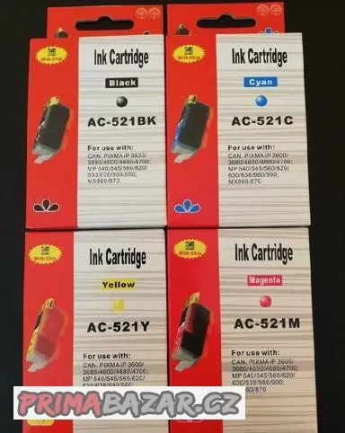 Prodám cartridge - 3x černá 520 xl 20ml, pak 3x černá 521 menší 11ml a dále 2x modrá 521C a 2x žlutá 521Y a 2x červená 521M. Všechny náplně jsou do tiskáren Canon. Osobní odběr Rosice.