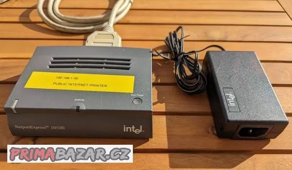 Tiskový server Intel se zdrojem. Po připojení napájení se rozbliká LED oranžově a po připojení do LAN ožijí LED ze zadní strany a ta na čelním panelu zůstane svítit zeleně. Více netestováno, ale je velká šance, že bude fungoval ????.