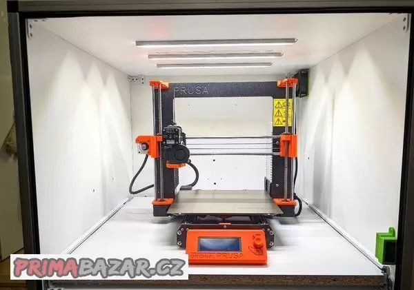 Box je dobře osvětlený 3 silnými led pásky. Má i ventilátor, takže se při dlouhém tisku komora nepřehřívá. Za ventilátor je možné instalovat uhlíkový filtr. Na světla i na ventilátor tam jsou 2 vypínače (ta hnědá krabička).